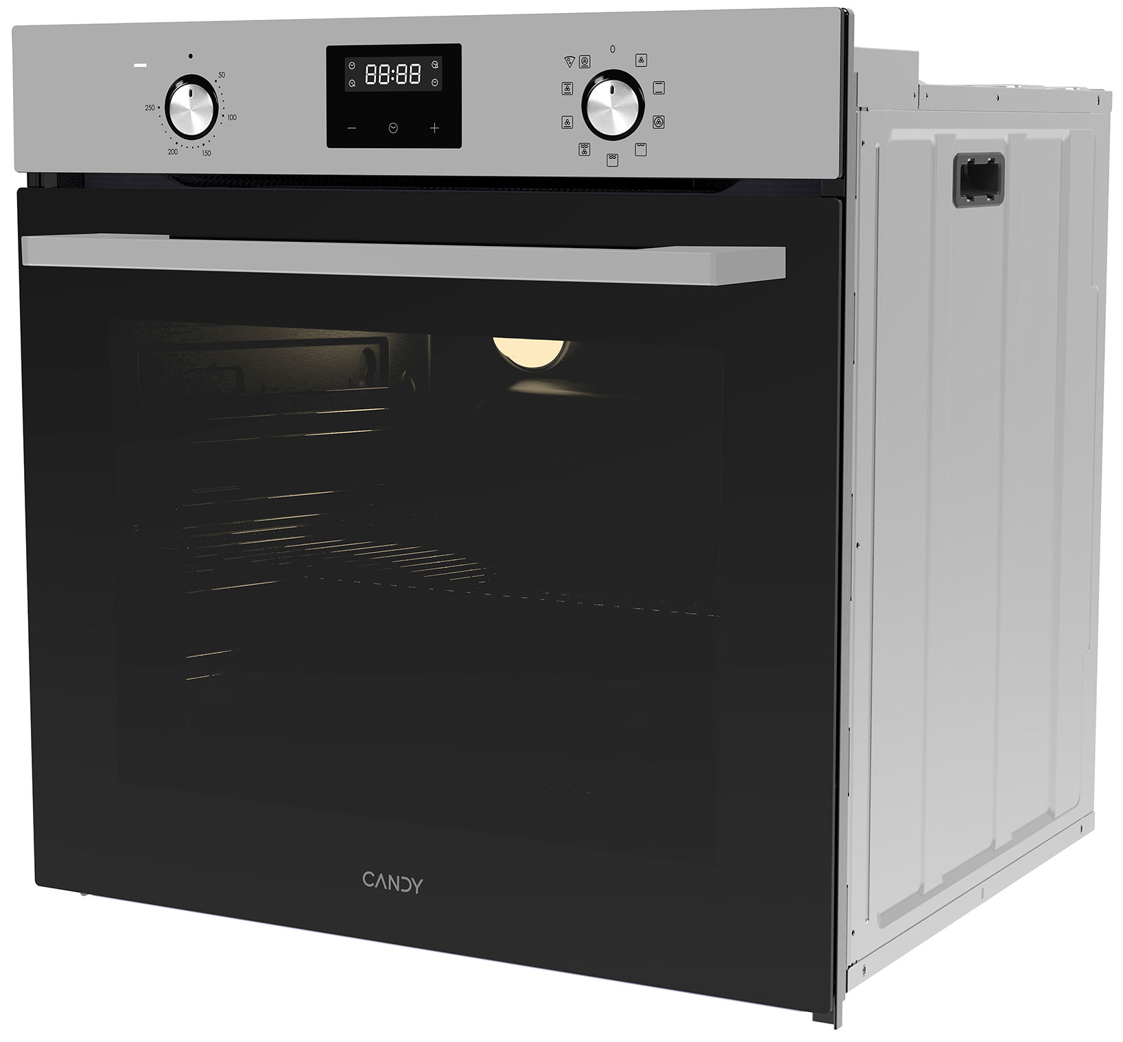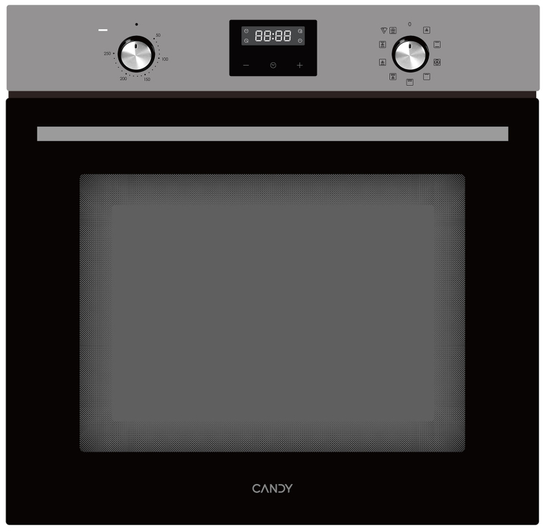 Candy COXP06TBX оснащен сенсорными кнопками, утапливаемыми поворотными переключателями и дисплеем с часами. Вы можете выбирать 1 из 6 режимов работы, температуру нагрева от 50 °C до 250 °C. Таймер с функциями простого оповещения и автоотключения не требует постоянного контроля за работой духовки. Встроенный вентилятор охлаждения двери защищает кухонную мебель от нагревания.