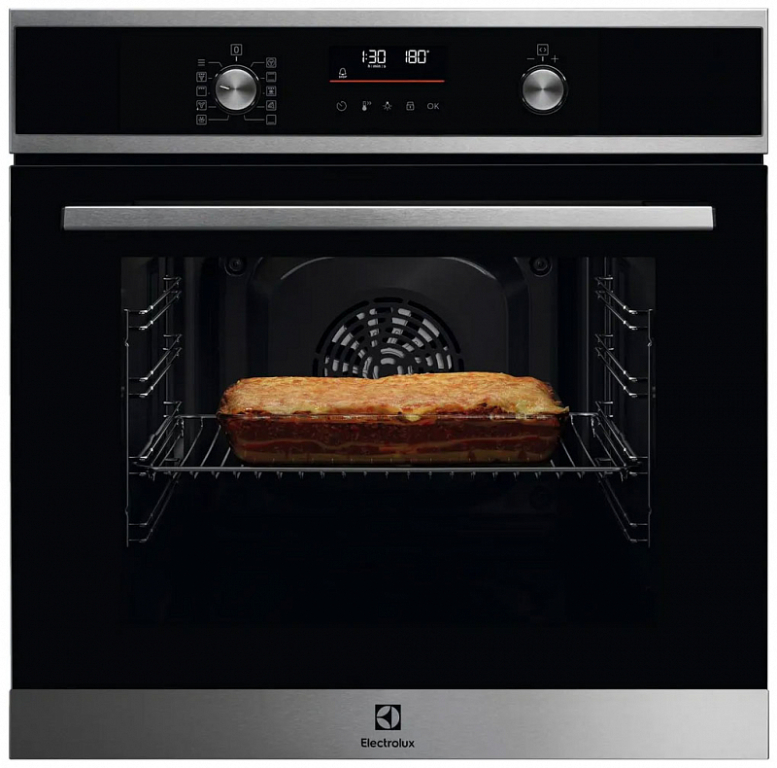 Для простой настройки нужных параметров на фронтальной панели расположены утапливаемые поворотные переключатели и сенсорный дисплей. Таймер предоставляет возможность программирования продолжительности выпекания. Функция блокировки исключает изменение установленных настроек. Подсветка позволяет контролировать степень готовности блюд. Система пиролитической очистки под действием нагрева превращает жир, нагар и загрязнения в пепел, что упрощает уход за внутренними стенками. В комплекте с духовым шкафом Electrolux COF6P76BX поставляются противень и решетка.