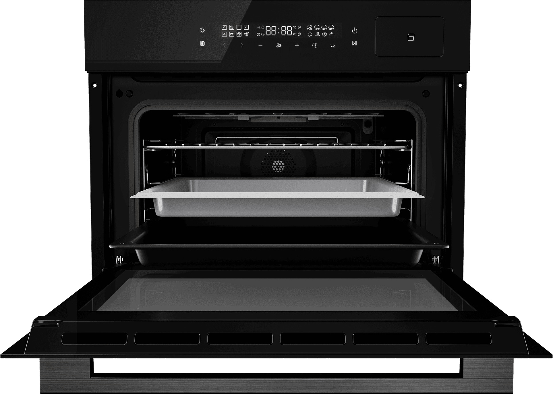 Приготовление под вакуумом (Sous-Vide). Этот режим позволяет раскрыть натуральный вкус продуктов и сохранить максимум полезных веществ. Точное поддержание температуры с шагом в один градус. Это позволяет готовить блюда даже при низких температурах от 30 градусов. Электронное устройство программирования. С его помощью можно задать время начала и окончания приготовления с автоматическим отключением духовки по истечении установленного времени. Интеллектуальное сохранение избранных режимов. Использованные режимы записываются в памяти, что избавляет от необходимости повторных настроек. Плавное закрывание дверцы. Специальные доводчики обеспечивают бережное использование духового шкафа. Резервуар парогенератора оснащён системой пуш-открывания и полностью вынимается для удобного наполнения водой и очистки. |
