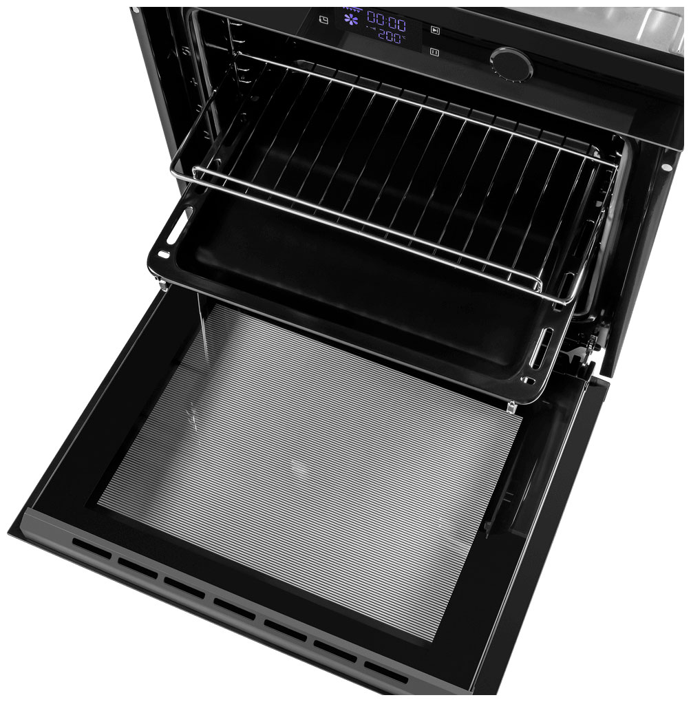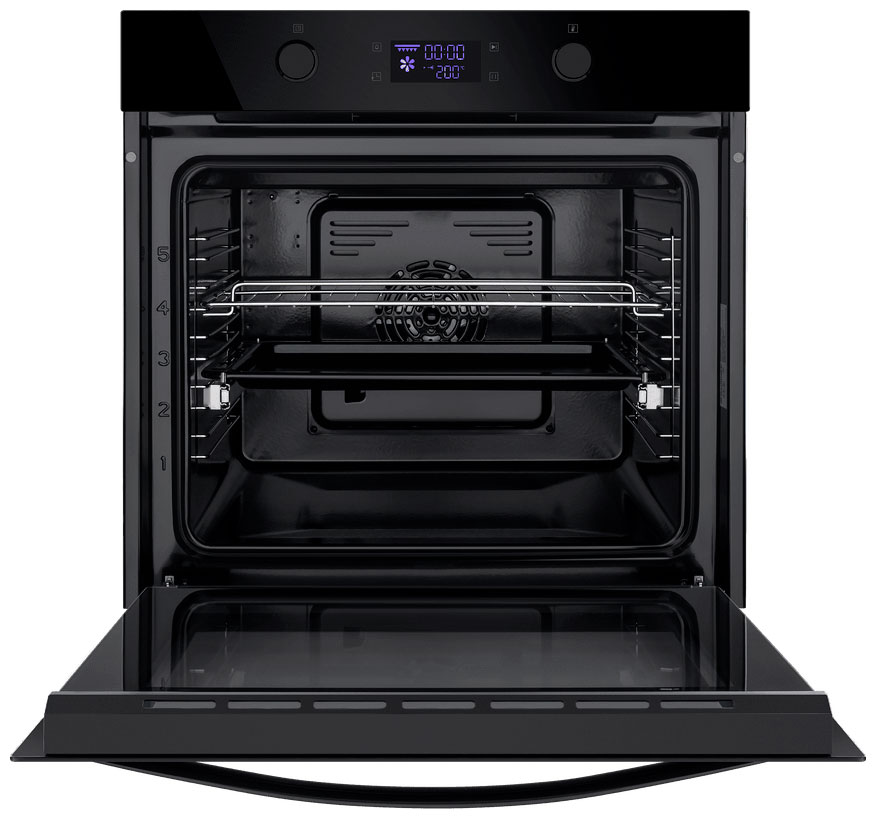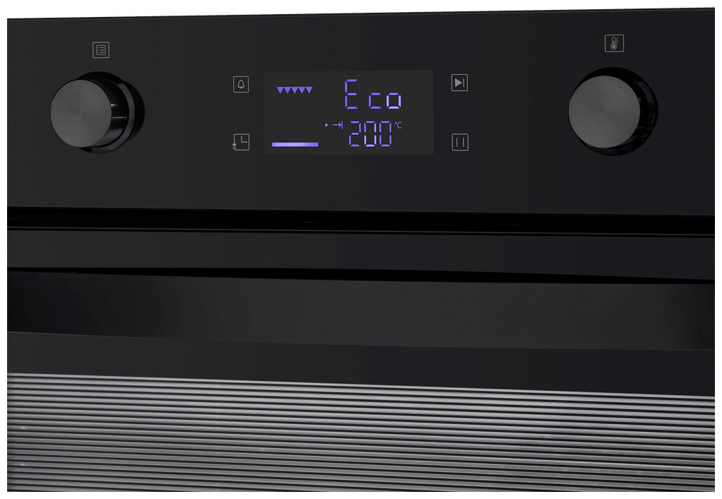 На панели управления расположены утапливаемые поворотные переключатели и сенсорный дисплей. С помощью таймера можно программировать необходимое время работы. Покрытие внутренних стенок на основе эмали легкой очистки гарантирует простое удаление жира, нагара, частиц пищи. Съемная конструкция стекла и направляющих упрощает уход за духовым шкафом MAUNFELD AEOH.749B2.