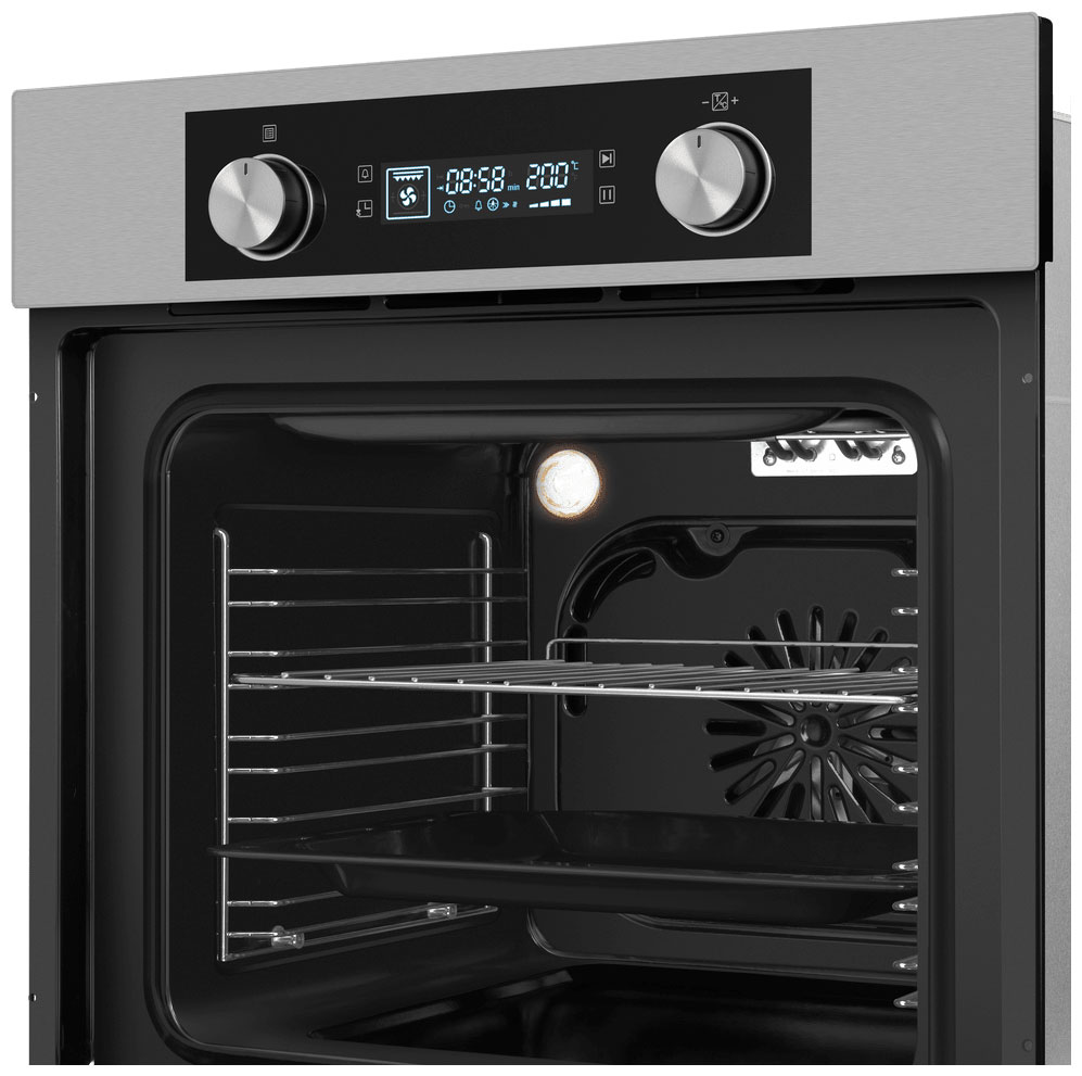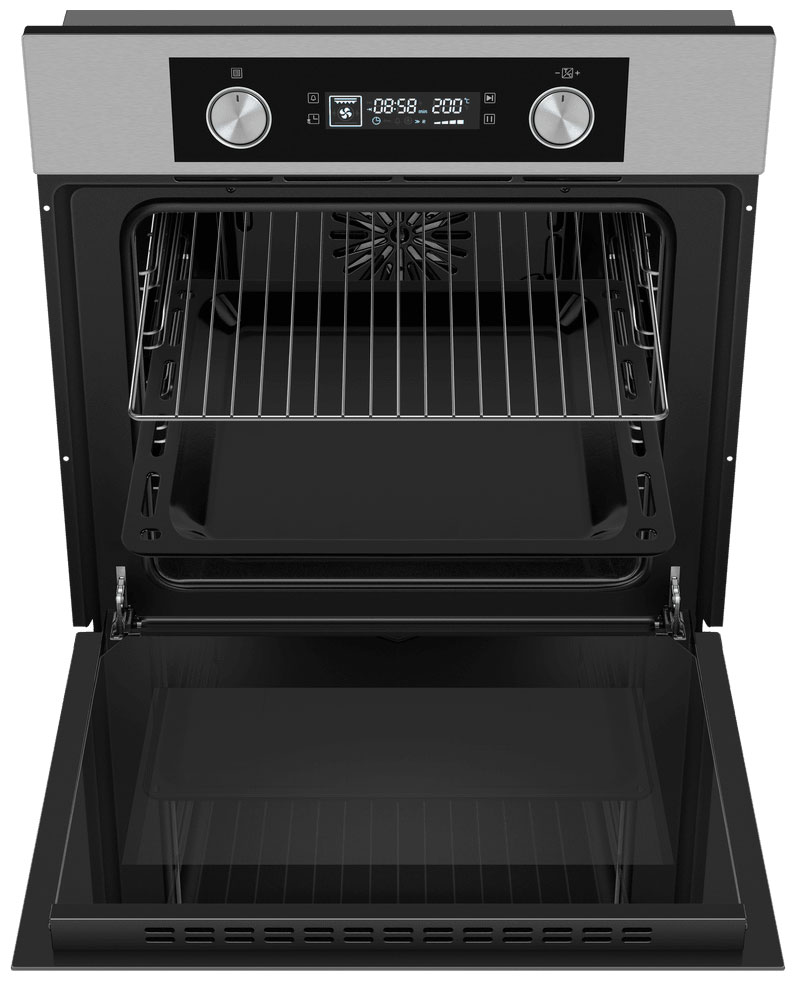 Большой объём 60 л. При таком объёме вы можете готовить одновременно несколько блюд, разместив решетку или противень на одном из 5 уровней боковых направляющих. Поворотные ручки PUSH PULL в сочетании с сенсорным управлением обеспечивают комфортное и наиболее точную регулировку параметров приготовления. Большой цифровой дисплей духового шкафа отображает всю необходимую информацию. Класс энергопотребления А - это гарантия эффективности устройства при минимальном расходе электроэнергии. Вы можете больше не думать о счетах за электроэнергию, а только наслаждаться приготовлением вкуснейших блюд в нашем духовом шкафу. Благодаря конвекции вы можете установить противень на любом уровне и получить равномерное пропекание, хрустящую корочку. Тепло распределяется по всему объёму духового шкафа, обеспечивая равномерное приготовление блюд.