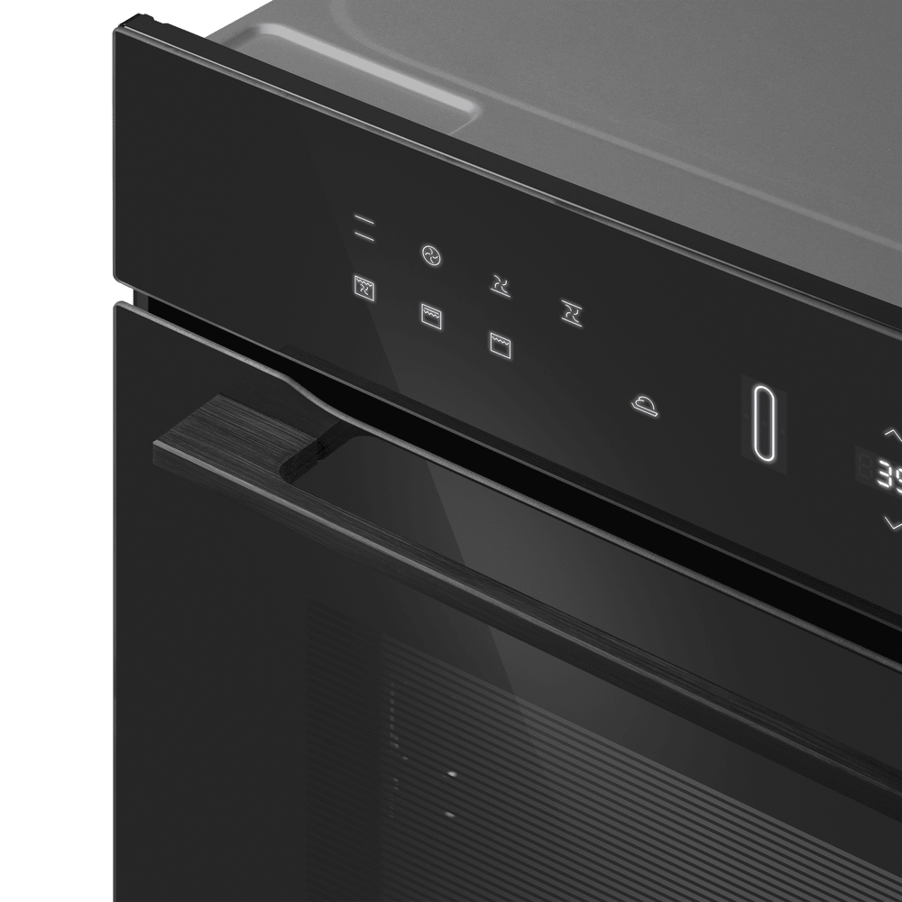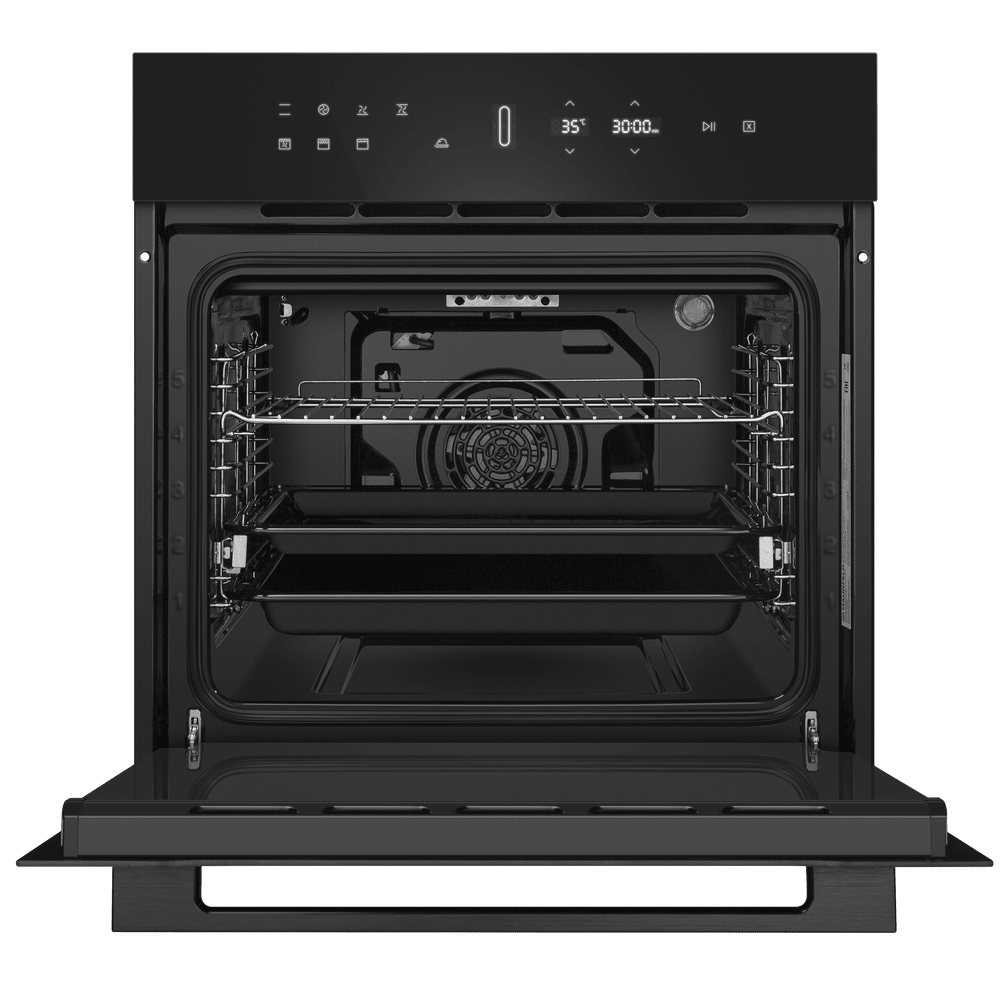 вентилятор охлаждения, дисплей, полностью стеклянная внутренняя поверхность дверцы духовки, телескопические направляющие |