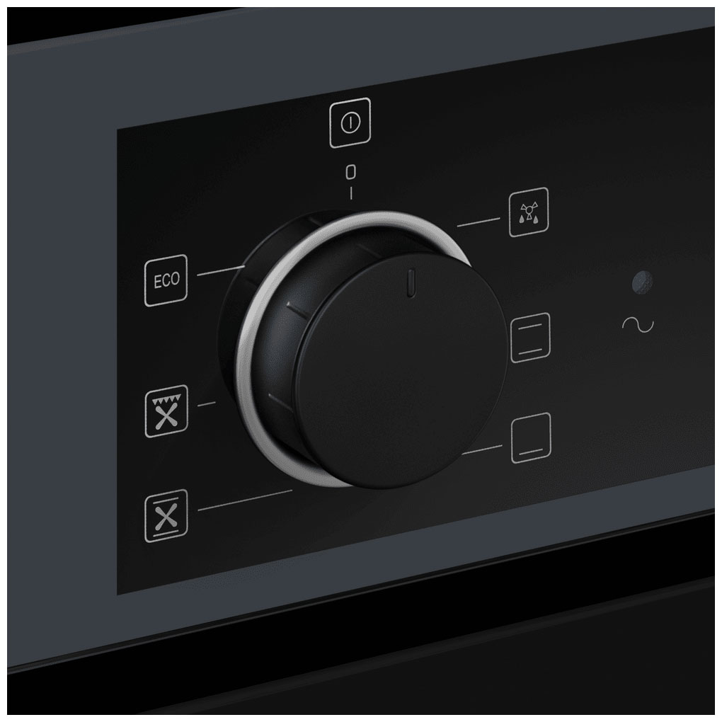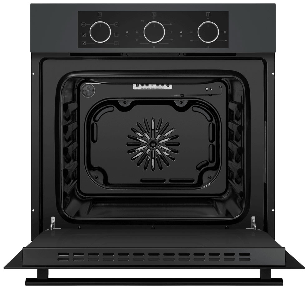 Эта встраиваемая электрическая печь выглядит сдержанно и современно: строгая плоская панель с черной фурнитурой, затемненное трехслойное стекло в дверце и поворотные рукояти с серебристой окантовкой создают деловой и спокойный образ, который не перетягивает внимание на себя, но задаёт тон. Откидная дверь открывается плавно, внутри видна объемная камера с гладким эмалированным покрытием, отражающим свет и упрощающим уход после готовки.