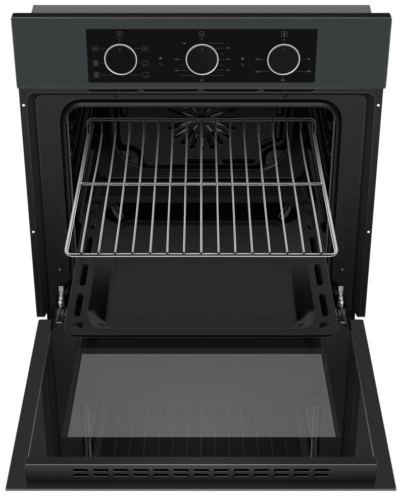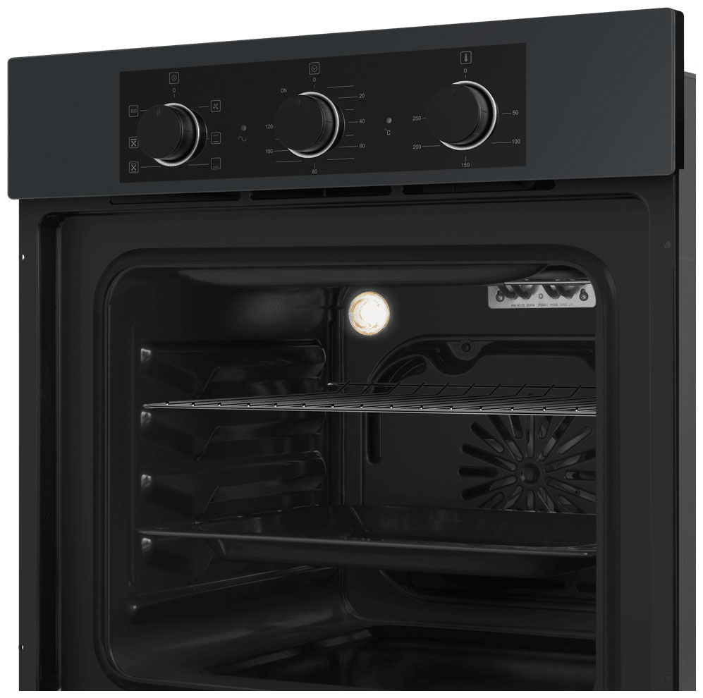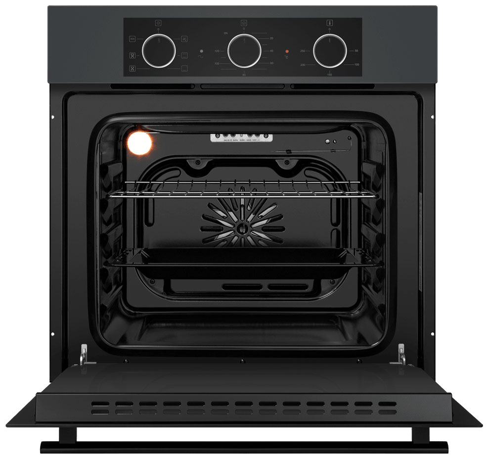 Набор программ несколько превышает минимум: кроме верхнего и нижнего нагрева, работы верхнего ТЭНа и гриля можно использовать конвекционную циркуляцию горячего воздуха и режим интенсивного жарения. Есть комбинированный режим гриль + конвекция, экономичный ECO-режим для контроля потребления энергии. Вместительность камеры — 59 литров, внутри доступно пять уровней размещения форм и противней, что удобно при одновременном приготовлении нескольких блюд.