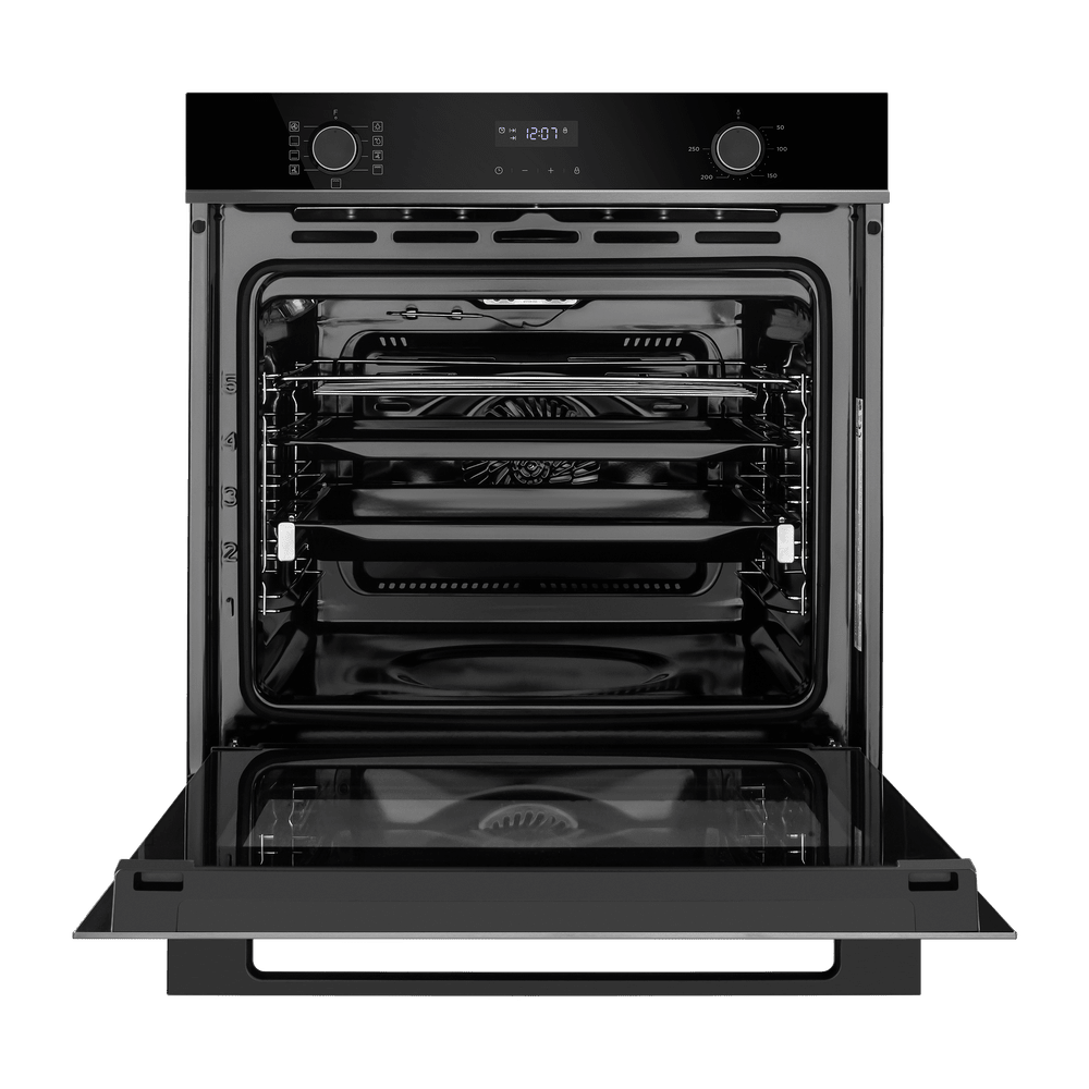 Габариты и глубина идеально подходят для стандартной ниши 57.6×56×54.6 см, а общий объем 72 литра делает прибор удобным для семьи. Пять уровней приготовления дают свободу одновременно готовить несколько блюд. Конвекция равномерно распределяет тепло по камере, сокращая время приготовления и позволяя получить хрустящую корочку при меньшей температуре. Электрический гриль с опцией конвекции подойдет для стейков и запеканок, обеспечивая равномерную золотистую поверхность.