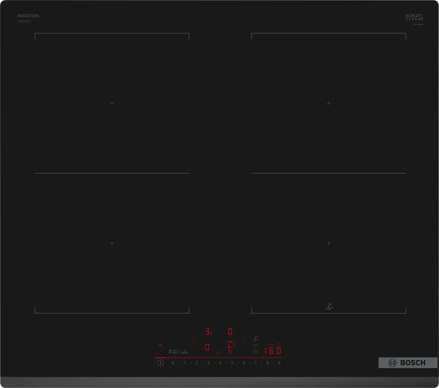 Индукционная варочная панель Bosch PVQ631HC1E — это высокотехнологичное устройство, которое сочетает в себе элегантный дизайн и функциональность. Изготовленная в Евросоюзе, эта модель оснащена четырьмя конфорками, обеспечивающими быстрый и равномерный нагрев. Серия Serie | 6 отличается своими компактными размерами, что позволяет установить панель даже на небольшой кухне. Материал поверхности — стеклокерамика, которая обладает высокой теплопроводностью и устойчивостью к механическим повреждениям. Особенностью дизайна является скошенный край, придающий панели элегантный и современный вид. Цветовое решение в черном цвете подчеркивает строгость и стиль модели, делая ее центром внимания на любой кухне. Управление панелью осуществляется с помощью сенсорных элементов, что делает процесс приготовления более комфортным и быстрым. Система управления DirectSelect позволяет легко и быстро выбирать нужную температуру и время приготовления. На TFT-дисплее отображается всю необходимую информацию, а таймер с функцией прямого отсчёта и автоматического отключения для каждой конфорки позволяет контролировать процесс приготовления. Модель оборудована функцией распознавания посуды, что позволяет экономить энергию и предотвращает нагрев пустой панели. Зона объединения CombiZone позволяет использовать две конфорки как одну большую, что идеально подходит для приготовления блюд в большой посуде. С помощью функций ReStart, QuickStart, PowerBoost и PowerManagement можно быстро начать приготовление, увеличить мощность нагрева и контролировать потребление энергии.