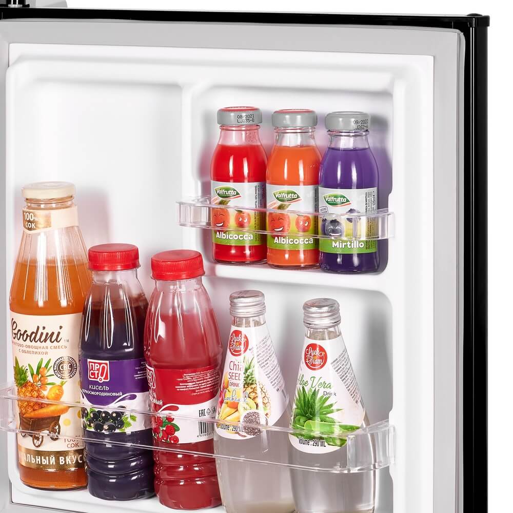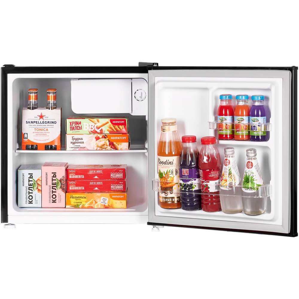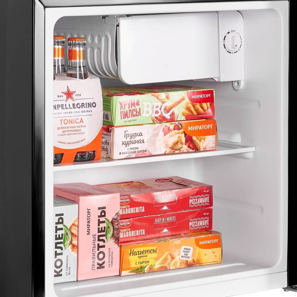 Внутреннее пространство организовано максимально рационально для объема в 50 литров. Одна прочная полка из закаленного стекла выдерживает повседневные нагрузки и легко чистится. Две полочки на дверце подходят для бутылок, соусов и мелких баночек, что помогает разгрузить основную площадь. Лампа накаливания внутри обеспечивает мягкое освещение, достаточное для быстрого поиска продуктов даже в вечернее время. Ручная система размораживания упрощает конструкцию и делает технику более ремонтопригодной; достаточно периодической очистки для поддержания эффективности.