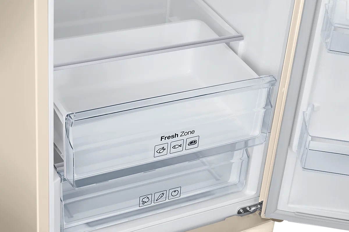 Холодильник Samsung RB37A5271EL, бежевый — двухкамерный прибор с холодильным отделением объемом 269 л и морозильным — 98 л. Размеры этой модели — 201х59,5х65 см, используется технология SpaceMax: увеличение объема за счет уменьшения толщины стенок без потери эффективности охлаждения.