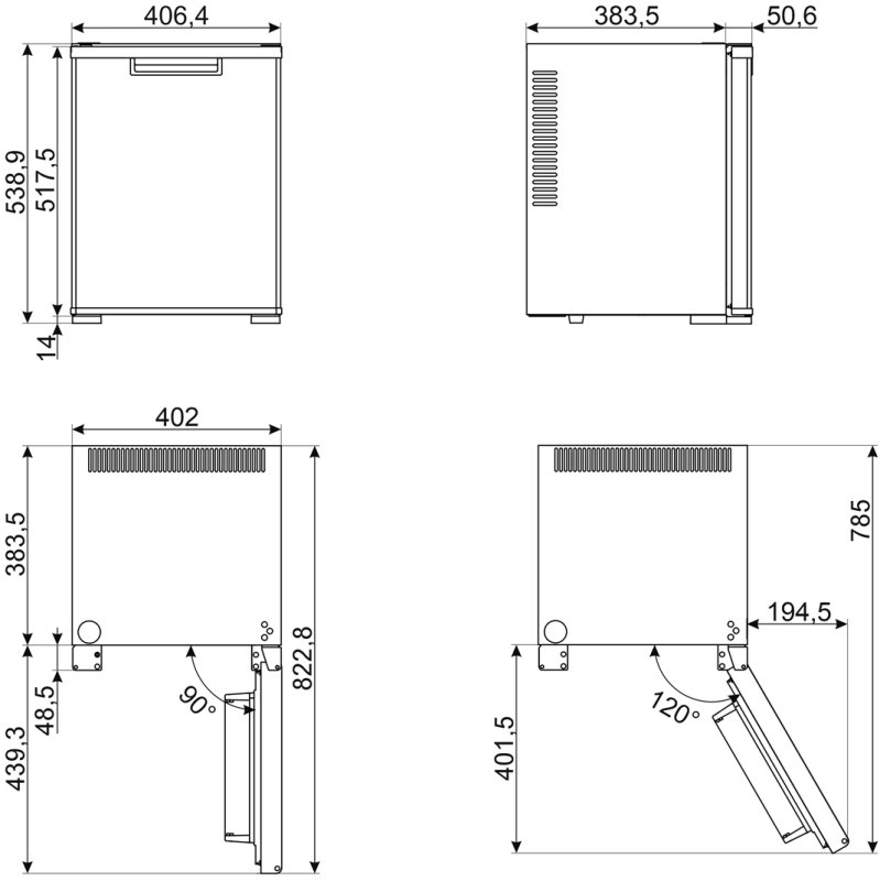 Высота мини-бара составляет всего 53 см, а объем — 40 литров, так что он может свободно размещаться под столешницей. Дверца открывается на широкий угол до 120 градусов, что также облегчает доступ к продуктам. Боковые стороны корпуса изготовлены из стали. Две полки в камере регулируются по высоте, их можно извлечь для размещения продуктов и упаковок большего размера. Автоматическая разморозка исключает образование наледи на стенках камеры и упрощает ее очистку. Климатический класс N, или нормальный, предусматривает использование прибора при наружной температуре от +16°С до +32°С.