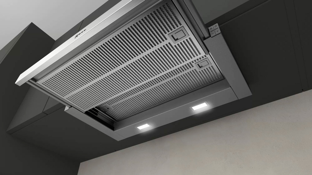 Кухонная вытяжка NEFF D46ED52X1 — это пример скрытой эффективности. Её главный козырь — полная интеграция в подвесной шкаф. После монтажа снаружи виден только неброский серебристый экран, который выдвигается при необходимости. Это идеальное решение для кухонь, особенно небольших, где важно сохранить чистые линии и не загромождать пространство над плитой.