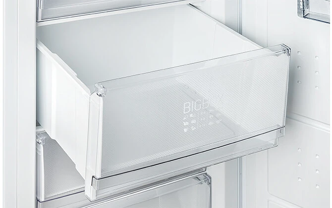 Увеличенная корзина BIG BOX расположена в нижней части морозильника и выполнена из ударопрочной прозрачной пластмассы, в которой можно разместить около 10 кг продуктов
