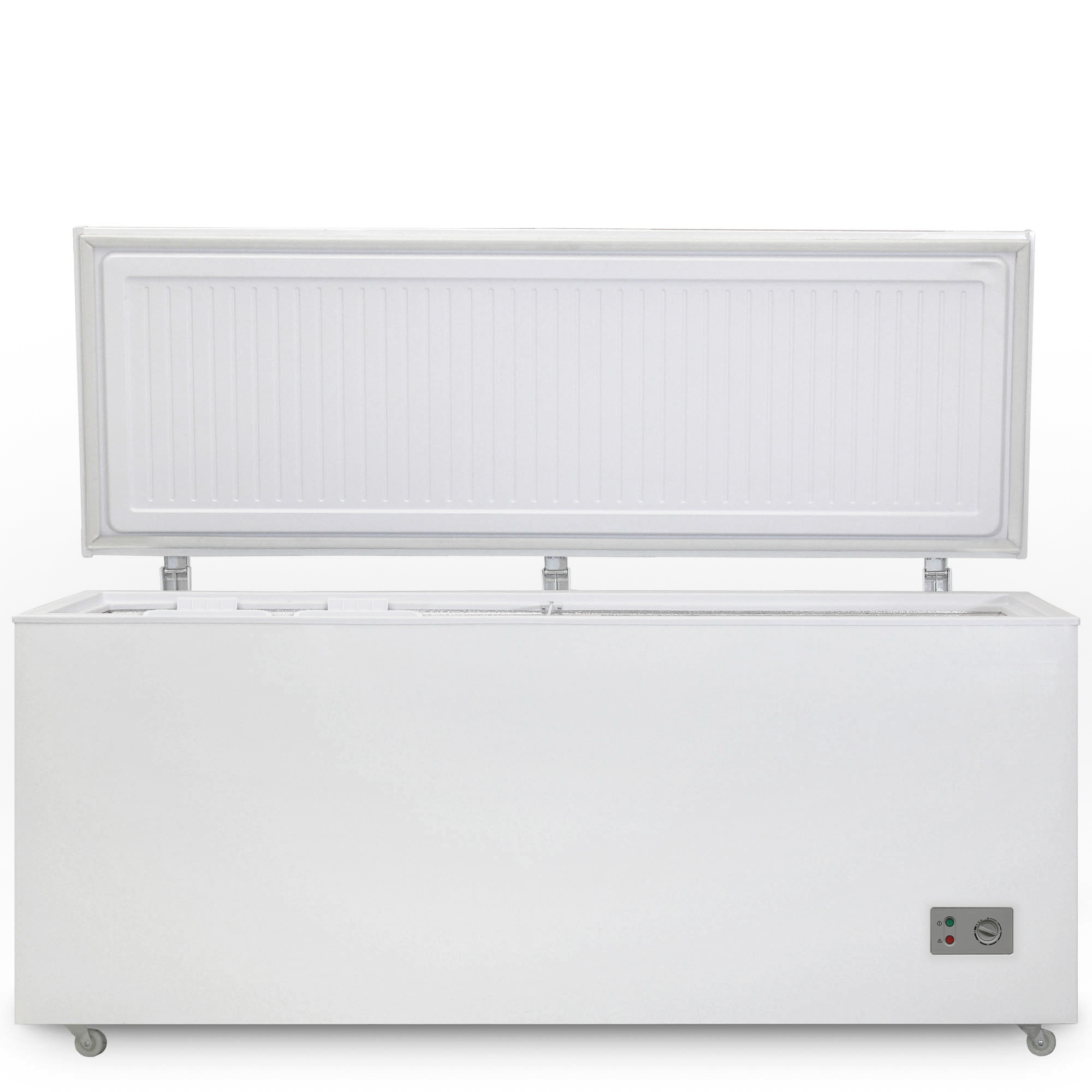 Морозильный ларь Бирюса 560KX предназначен для хранения замороженных продуктов и полуфабрикатов. Он характеризуется полезным объемом 510 л и двумя вместительными подвесными корзинами. Минимальная температура охлаждения составляет -18 °C, а с помощью поворотного переключателя можно плавно регулировать температурный режим и интенсивность охлаждения в камере. Рядом с переключателем расположены световые индикаторы состояния.