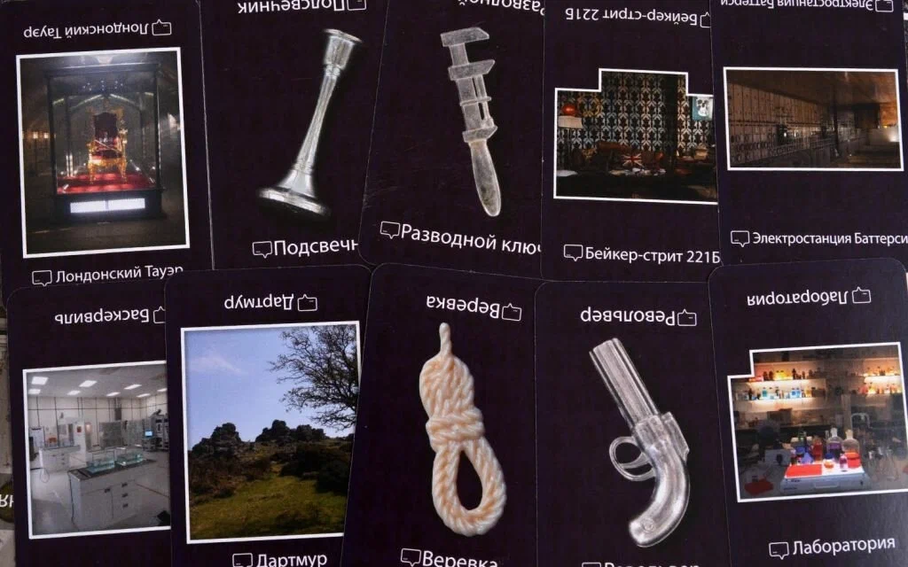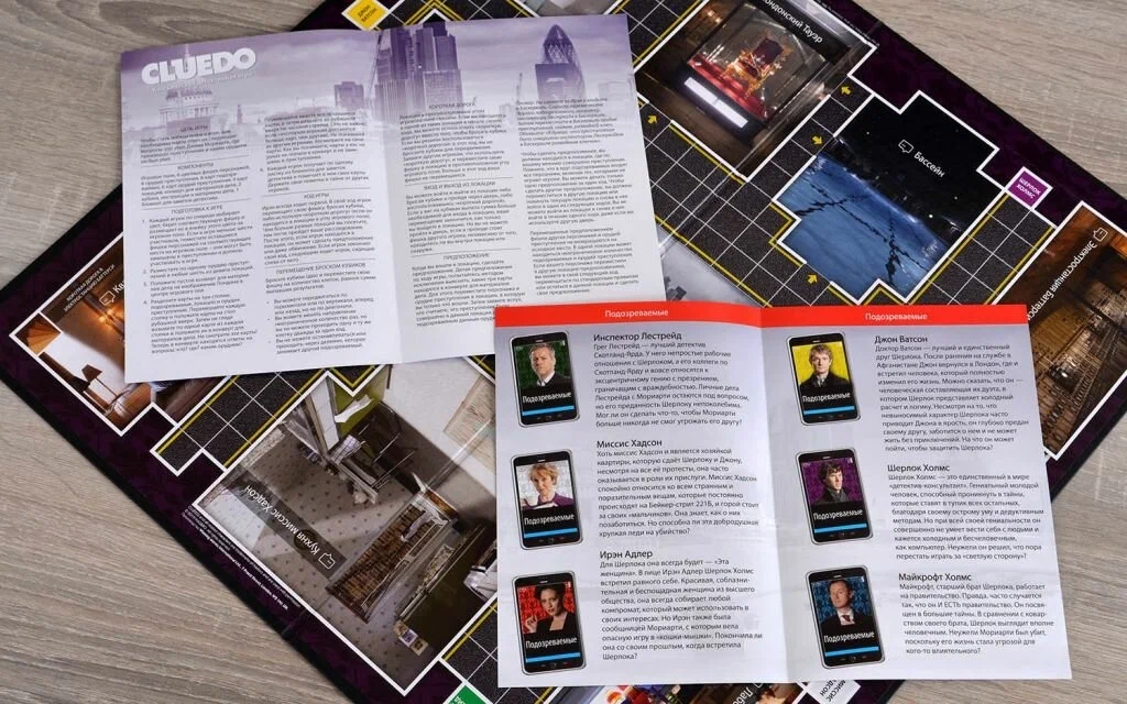 Cluedo Шерлок – новая версия знаменитой детективной игры, теперь по мотивам популярного сериала Шерлок. Cluedo – идеальный детектив в настольном формате. Если Вы зачитывались Конан Дойлем и Агатой Кристи, если всегда хотели примерить на себя кепку Шерлока или шикарные усы Пуаро – добро пожаловать! Cluedo была придумана специально для Вас. Смысл: строим теории, выдвигаем гипотезы, задаём неудобные вопросы, выясняем о происходящем как можно больше и вычисляем убийцу… или выводим из игры всех, кто идёт по следу, если убийца – это ты. Почему именно Шерлок? Потому что высокоактивный социопат с Бейкер-стрит – самый харизматичный, утончённый и остроумный британский детектив 21-го века! Моффат идеально адаптировал легендарного героя к современным реалиям, а теперь – с новым изданием Cluedo – Вы можете почувствовать себя в роли лучшего сыщика с нашей эпохи. Вас ждут знакомые персонажи, точно перенесённые на бумагу локации из сериала и лихо закрученная интрига. Вооружайтесь детективным методом, и вперёд – в игру! Комплектация Внутри красочной упаковки Вас ждёт искусно стилизованное под сериал игровое поле, а также: 2 счастливых кубика; 6 оригинальных орудий преступления – и 6 фишек, для каждого из них; 6 карточек со старыми знакомыми: персонажами Шерлока; 6 фишек для них же; 9 карточек с локациями; Большой Чёрный Конверт с Ответом на Страшную Тайну; Стильный блокнот опытного сыщика.