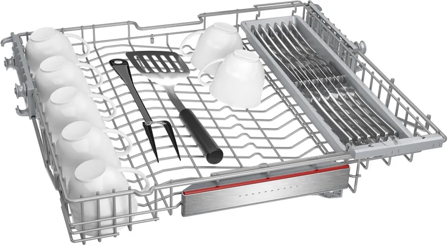 Панель управления открытая, с сенсорными кнопками и дисплеем. Также есть возможность удаленного запуска через приложение на смартфоне благодаря функции Home Connect. Индикаторы наличия ополаскивателя, соли и времени до окончания программы помогают контролировать процесс мытья. Таймер отсрочки запуска позволяет запланировать начало работы машины в удобное для вас время. Машина имеет три корзины, в том числе переставляемую по высоте верхнюю корзину с системой Rackmatic-3 и корзину для столовых приборов в нижнем коробе. Система AquaStop и полная защита от протечек обеспечивают безопасность использования. Блокировка от детей предотвращает случайное включение или изменение программы.