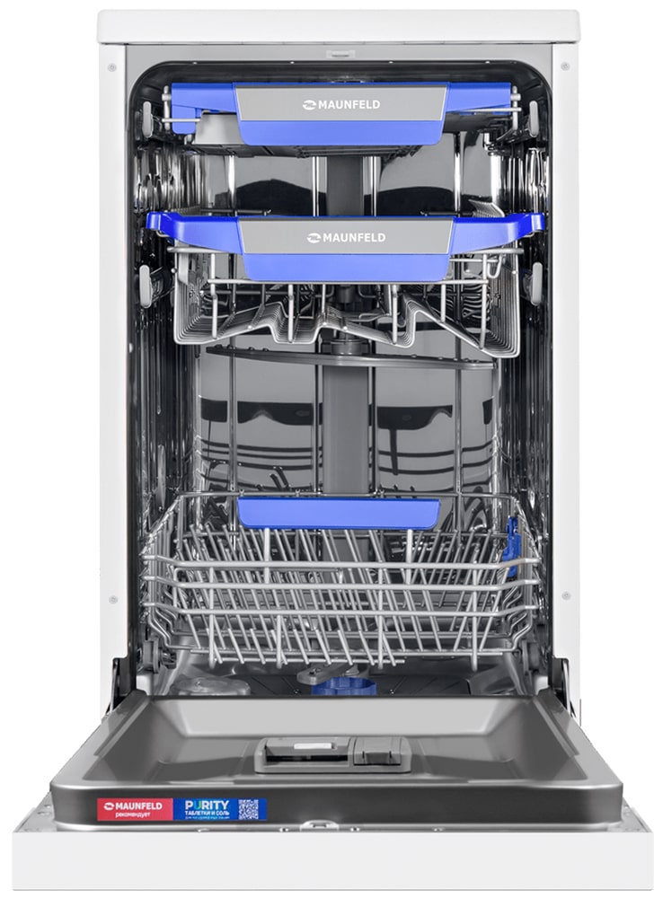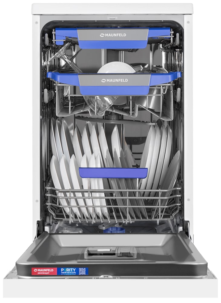 Регулируемая по высоте верхняя корзина. Позволяет разместить даже крупные предметы, такие как кастрюли и сковороды. Опустить или поднять корзину можно одним нажатием рычага Отдельная полка для столовых приборов. Ускоряет раскладку и улучшает качество мойки. Направляющие для тарелок в двух уровнях. Полочка для чашек в верхнем коробе Также есть функция автоматического открытия дверцы после окончания мойки, чтобы из внутренней камеры вышел лишний пар и улучшилась сушка. |