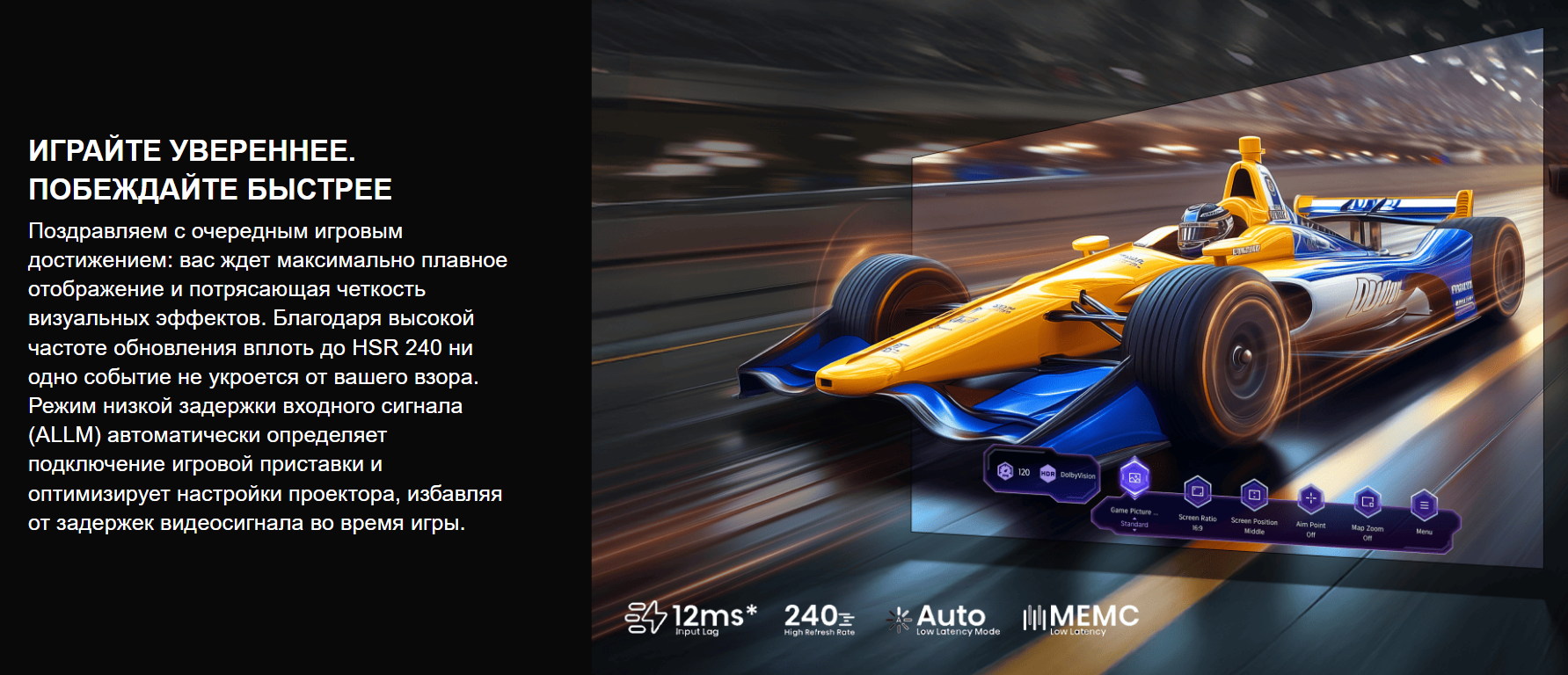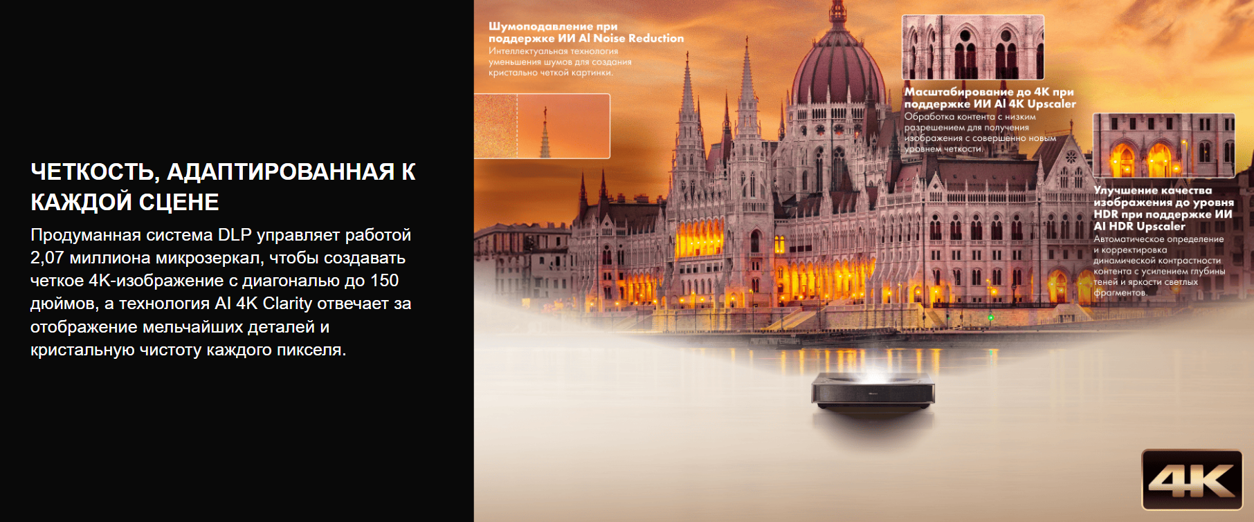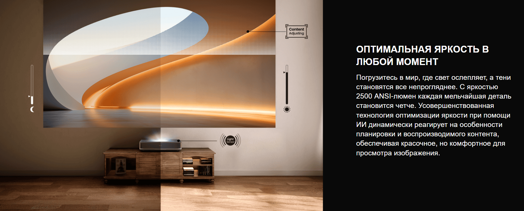 Яркость проектора — 2500 ANSI-люмен. Каждая деталь становится чётче, а усовершенствованная технология оптимизации яркости с помощью ИИ подстраивается под особенности планировки и контента, обеспечивая комфортное для просмотра изображение.