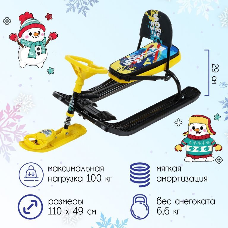 Снегокат предназначен для перевозки детей по плотному снегу или льду, катанию с горок. Имеет сварную конструкцию из стальных труб и пластиковых элементов. Оснащён мягким сиденьем, обтянутым искусственной кожей с рисунком, складной спинкой и двухточечным ремнём безопасности. Оборудован буксировочным тросом с автоматической намоткой и системой амортизации, которая обеспечивает комфортную поездку по крутым горкам и неровным поверхностям. Усиленный тормоз эффективен на обледенелой поверхности.