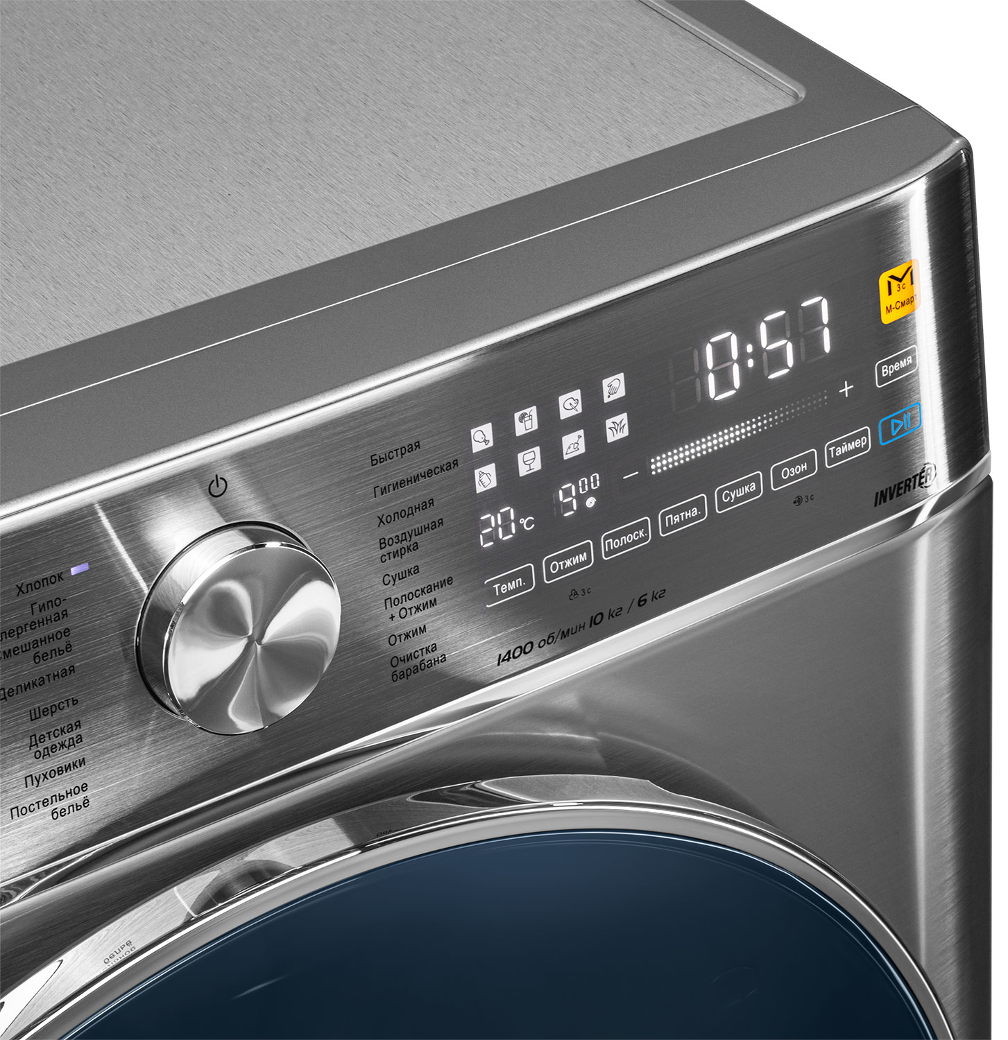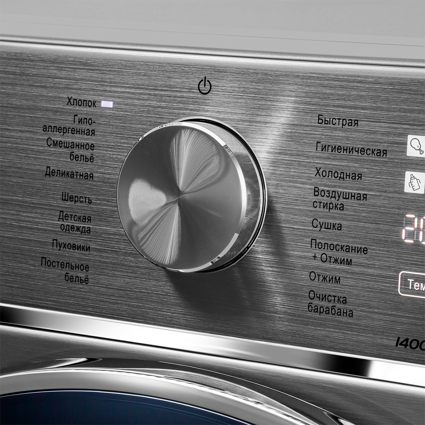 Скорость отжима составляет не более 1400 оборотов в минуту. Класс энергоэффективности — В (1,1 кВт*ч за цикл). Есть режимы «Пуховые изделия», «Антисминание после сушки», «Очистка барабана». Возможно отложить старт от 1 до 24 часов. Есть защита от протечек, блокировка от детей и контроль пенообразования.