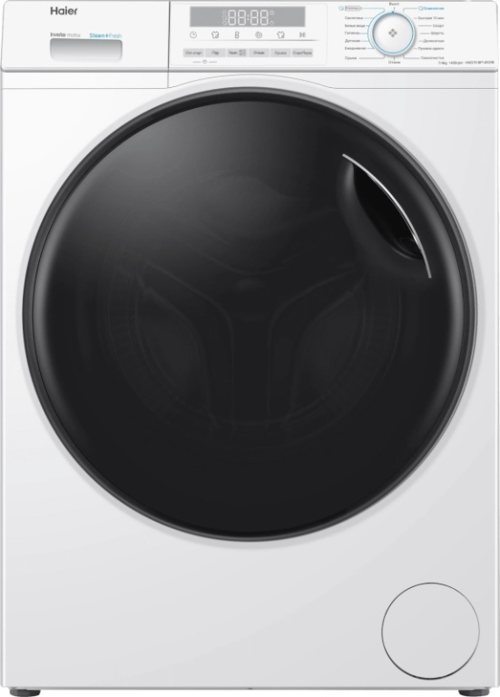 Стирально-сушильная машина Haier HWD70-BP14929B с фронтальной загрузкой на 7 кг оборудована поворотными переключателями для доступа к 15 программам. Устранить бактерии и предупредить образование складок позволяет режим обработки паром. За один цикл модель способна высушить до 4 кг белья. Уменьшением расходов на электричество занимается инверторный двигатель.