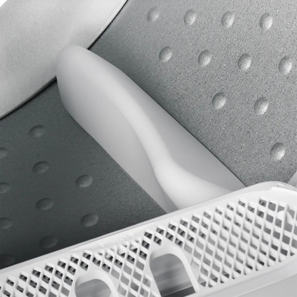 Дизайн устройства выполнен в стиле High-Tech. Белый корпус сочетается с черной панелью управления и дверцей люка, создавая элегантный и современный вид. Панель управления наклонена для удобства использования, а управление осуществляется с помощью поворотного программатора и сенсорных кнопок. Также стоит отметить наличие LED-дисплея, который показывает ход программы, время до окончания сушки и продолжительность отсрочки пуска. Таймер отсрочки старта позволяет запланировать сушку на удобное для вас время, а минимальное и максимальное время установки таймера составляет 1 и 23 часа соответственно.