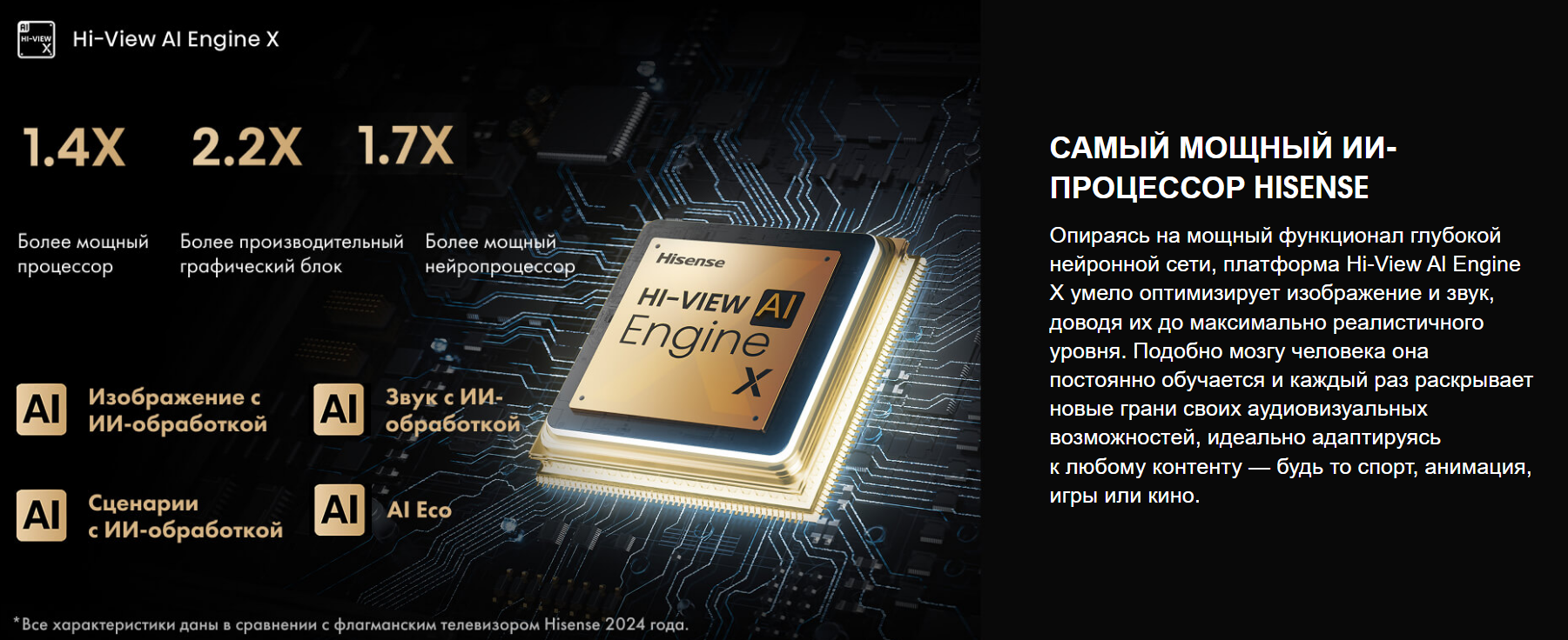 Технология Hi-View Engine от Hisense — это и «мозг», и «мускулы» вашего телевизора. Мощная нейросеть постоянно оптимизирует изображение путем анализа кадров в режиме реального времени, чтобы добиться наилучшего качества видео. |