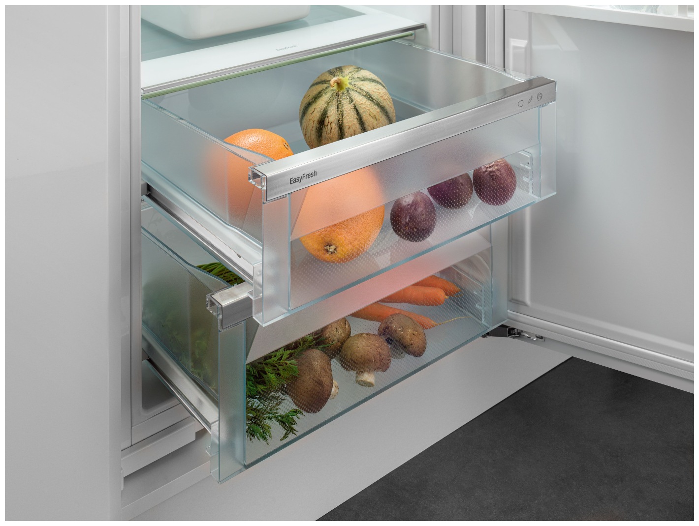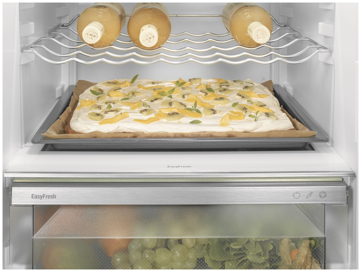 В холодильнике достаточно места для хранения противня. Особенно практично: противень можно задвигать и выдвигать при открытой на 90° двери - Светодиодное освещение