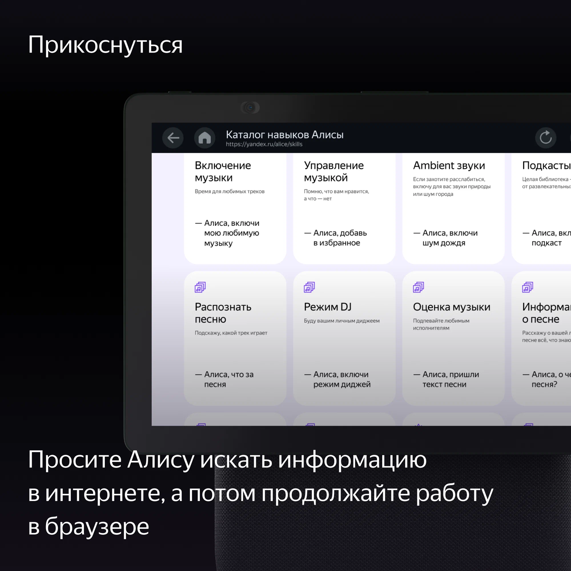 Просите Алису искать и включать музыку, фильмы или сериалы¹, а потом управляйте контентом на экране касаниями: перематывайте, ставьте на паузу и выбирайте нужное. Смотрите телеканалы. Задавайте Алисе вопросы — и не только слушайте её ответы, но и смотрите их на экране. Или пользуйтесь браузером.